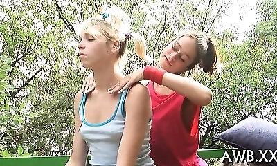 Elderly lady sees two teen lesbians caressing each other