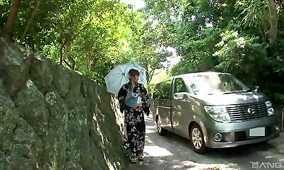 Kimono female in a van sucks dick and gets toy fucked