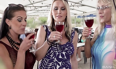 busty milf in un costume da bagno gode di un trio lesbico con due adolescenti