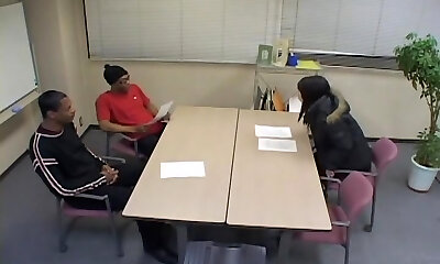 giapponese floozy in un fuso di threeway agire con due ebano borchie
