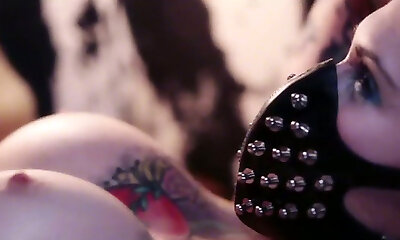 goth dame lavora il suo labbra con un massaggiatore e pops