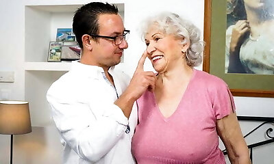 Trashy grandma nurse Ellen opens pussy lips showing the hallway close-up