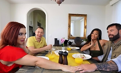 Black and white couples arrange dirty fucky-fucky fun in the hall