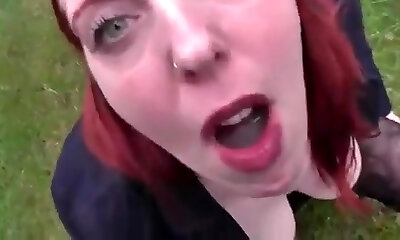 Redhead Deutsch cougar works that big fuck-stick with her ass and mouth in the park